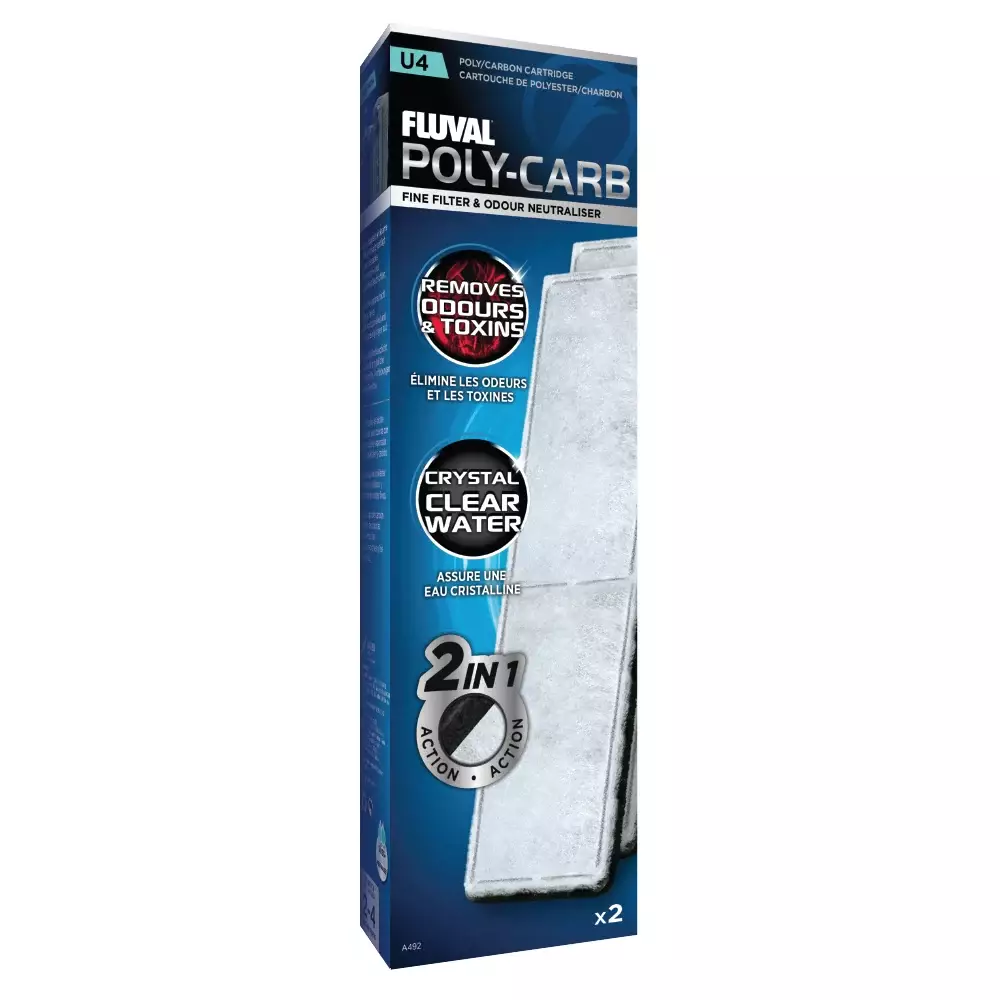 Fluval U4 -suodattimeen suunnitellussa U4 Poly-Carb -patruunassa on kaksi erilaista suodatuspuolta, jotka yhdessä tarjoavat perusteellisen kemiallisen suodatuksen.