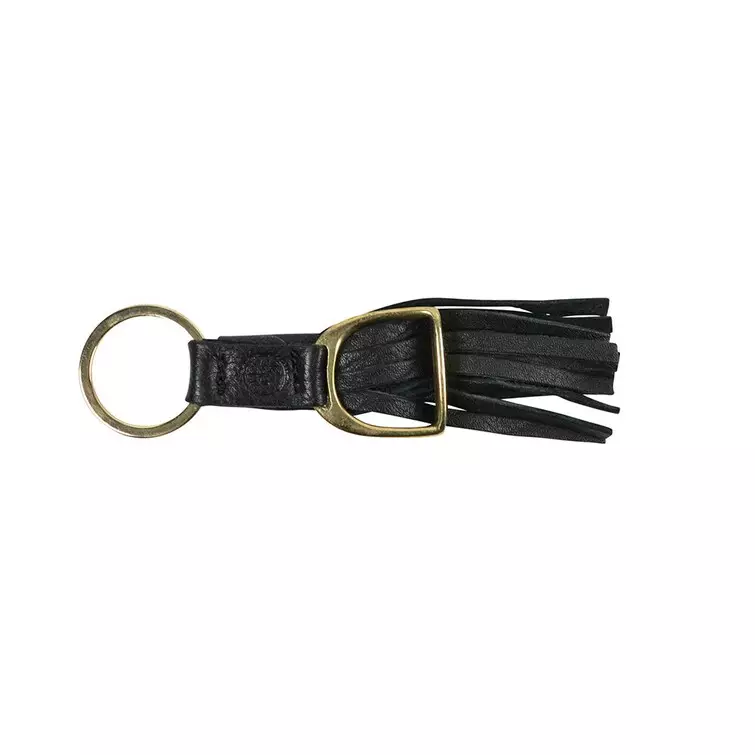 Tyylikäs mustasta nahasta valmistettu avaimenperä missä kultainen jalustin.