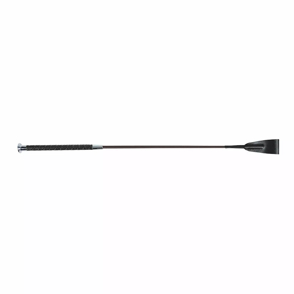 Tyylikäs esteraippa, jossa on koristeellinen hopeanvärinen nuppi. Otetta helpottava kahva ruskealla punotulla keinonahalla, mikä tekee piiskasta optimaalisesti käteen sopivan.