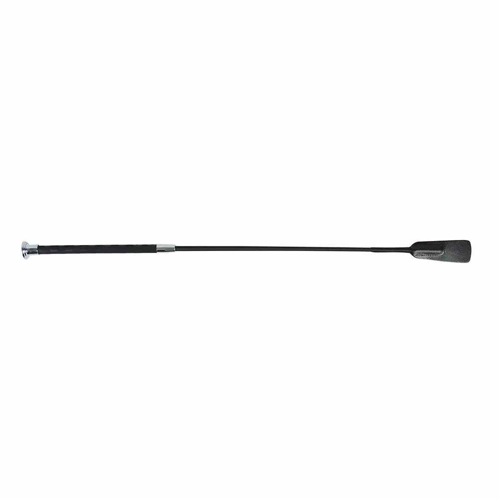 Tyylikäs raippa nahkapäällä ja koristeellisella hopeanvärisellä nupilla. Pehmeä ja hyvin otetta pitävä kahva samettisella tuntumalla.