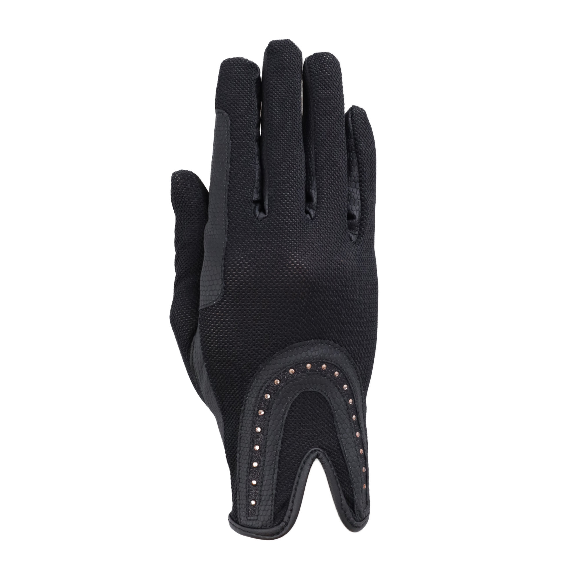 Tyylikkäät Good Luck Glitter -hanskat kisoihin. Ranteessa ruusukullan väriset koristekivet. Takaosa on hengittävää verkkomateriaalia, lisäksi Touch Screen -sormenpää.