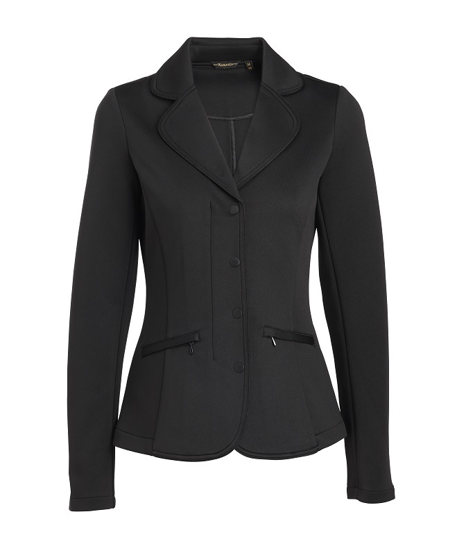 Materiaalin joustavuuden ansiosta kilpailutakki on erittäin miellyttävä päällä. Tyylikäs musta takki hienostuneilla mustilla yksityiskohdilla. Vetoketjulliset taskut edessä. Takana kaksi ratsastushalkiota lisää istuvuutta.
