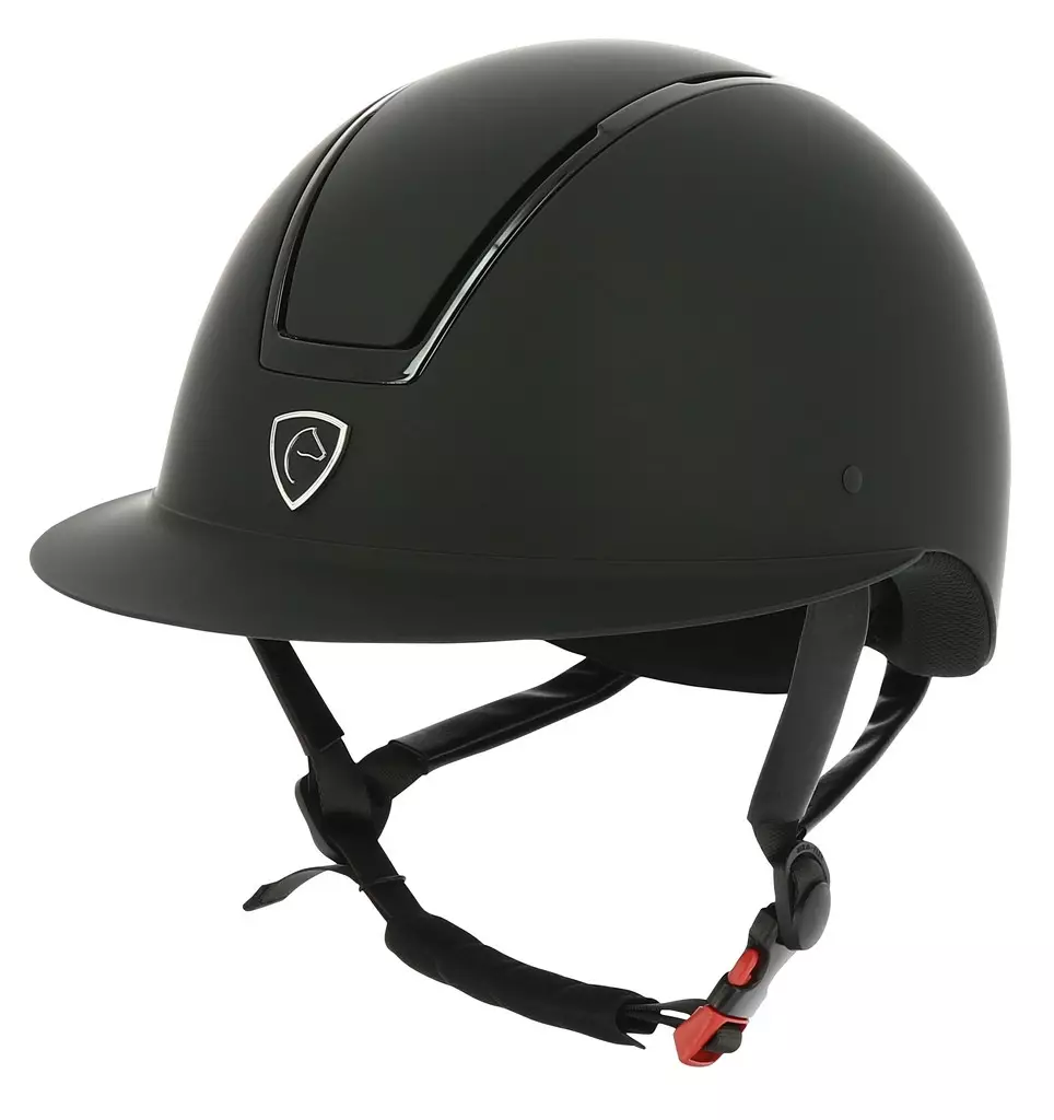Sileä mattapintainen ratsastuskypärä ilmastointiaukoilla, konepestävä pehmuste. Joustava lippa, 3-piste kiinnitys pikalukoilla.