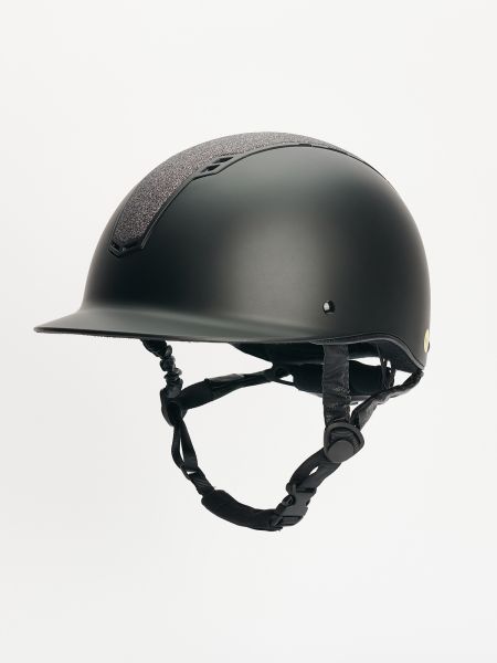 VG1 hyväksytty kypärä MIPS-järjestelmällä. Koko musta, glitterpaljeteilla. Säädettävä koko, leukahihna päällystetty synteettisellä nahalla.