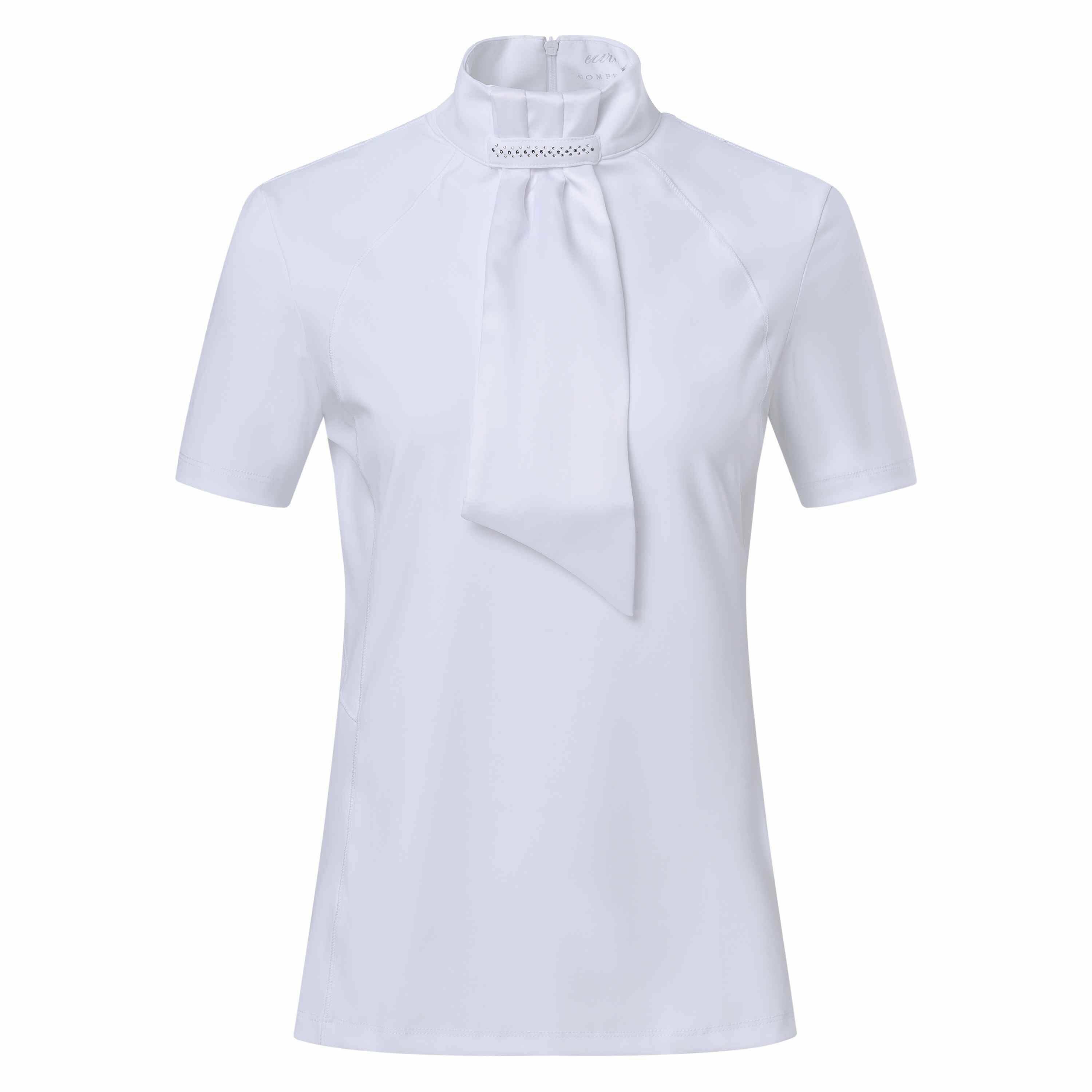 Lyhythihainen kilpailupusero irrotettavalla, strassikoristeisella kaulushuivilla. Huomaamaton vetoketju kauluksen takana.