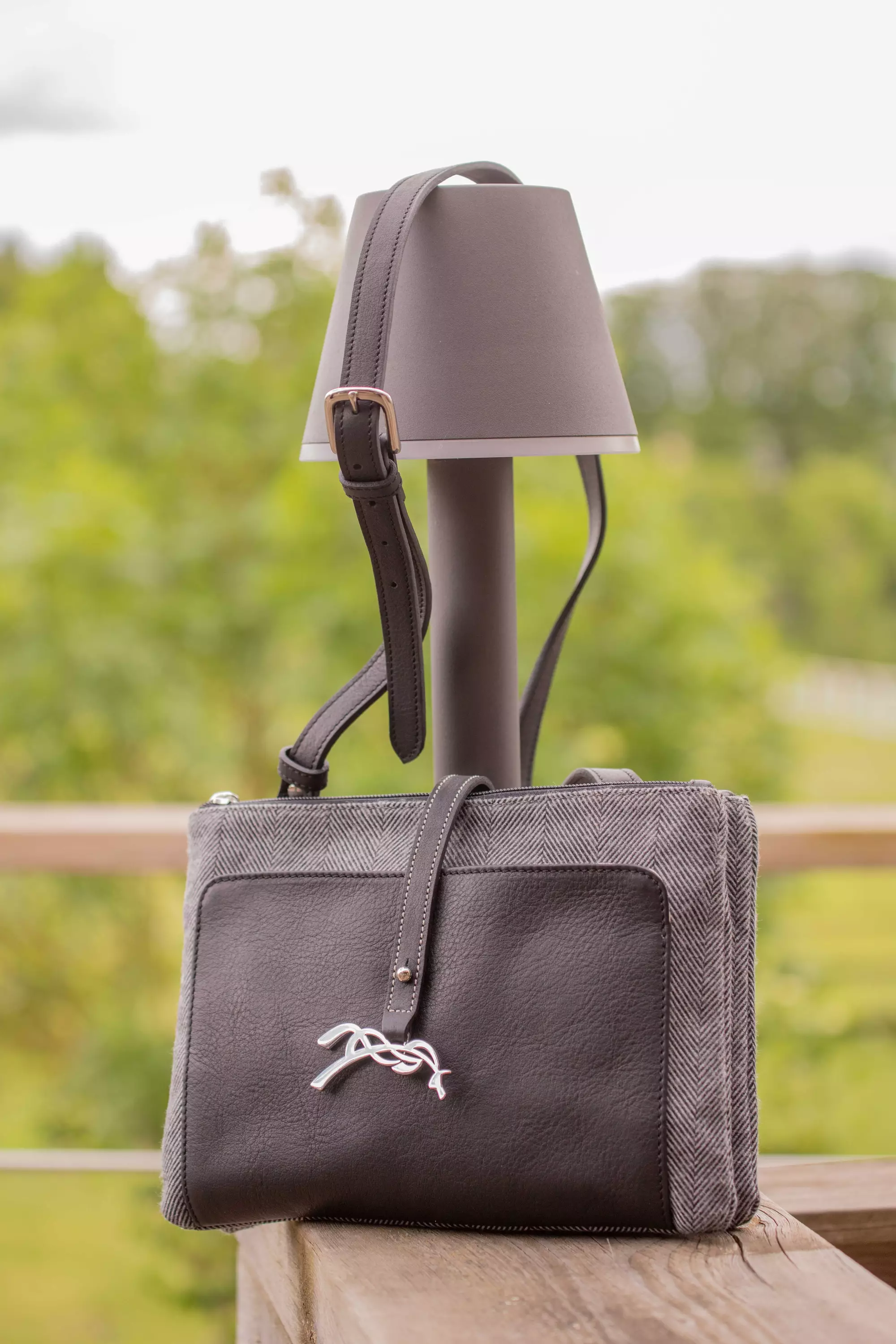 Tyylikäs Pablito-laukku on valmistettu kalanruotokuvioidusta kankaasta ja laadukkaasta nahasta. Säädettävä olkahihna mahdollistaa mukavan käytön olalla. Laukussa on kaksi vetoketjullista lokeroa, jotka sulkeutuvat ohuella nahkahihnalla. Hihnaa koristaa hopeanvärinen Pénélope-logo. Harmaan sävyinen, paksu kalanruotokangas yhdistettynä kauniiseen konjakinväriseen nahkaan tekee laukusta ajattoman ja elegantin.