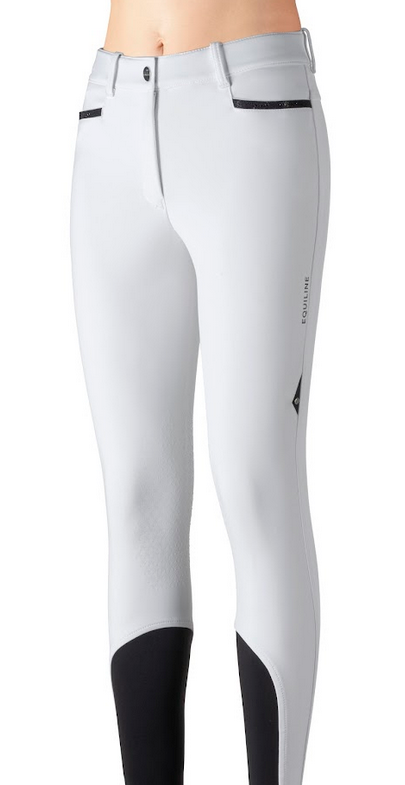 "Equiline" -logo on painettu jalkaan strasseilla, ja housuissa on polvigripit.