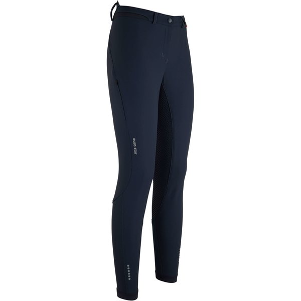 Kokogrip-paikoilla varustetut Queen ratsastushousut ovat erittäin mukavat päällä. Innovatiivinen vyötärön leikkaus lisää mukavuutta selälle, pitäen selän lämpimänä. Oikeassa reidessä vetoketjullinen tasku, esimerkiksi puhelimelle. Funktionaalinen kangas on vettä ja likaa hylkivä. 4-suuntaisen strecth kankaan ansiosta housut istuvat hyvin ja tuntuvat mukavilta jalassa. Strasseilla koristellut Euro-Star logot reidessä sekä takana vyötärössä. Strassit myös molemminpuolin vyötäröllä.