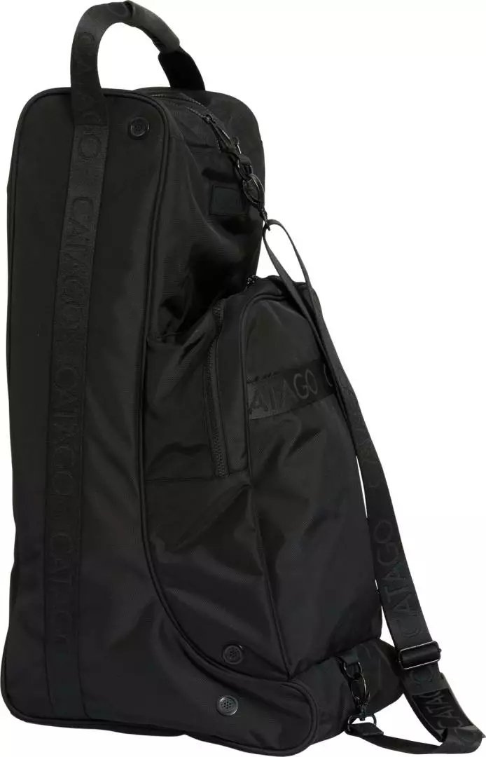 Yksi suuri päälokero saappaille ja pienempi lokero kypärälle – molemmat suljetaan kaksisuuntaisella vetoketjulla. Pienempi tasku suitsien kuolaimille, suojille ja muille tarvikkeille. Tyylikkäät logonauhayksityiskohdat, kuminen merkki, jykevät vetoketjut ja näyttävät vetimet luovat urheilullisen ilmeen. Muovinen kahva helpottaa kantamista. Kestävä 840D nailonkangas.