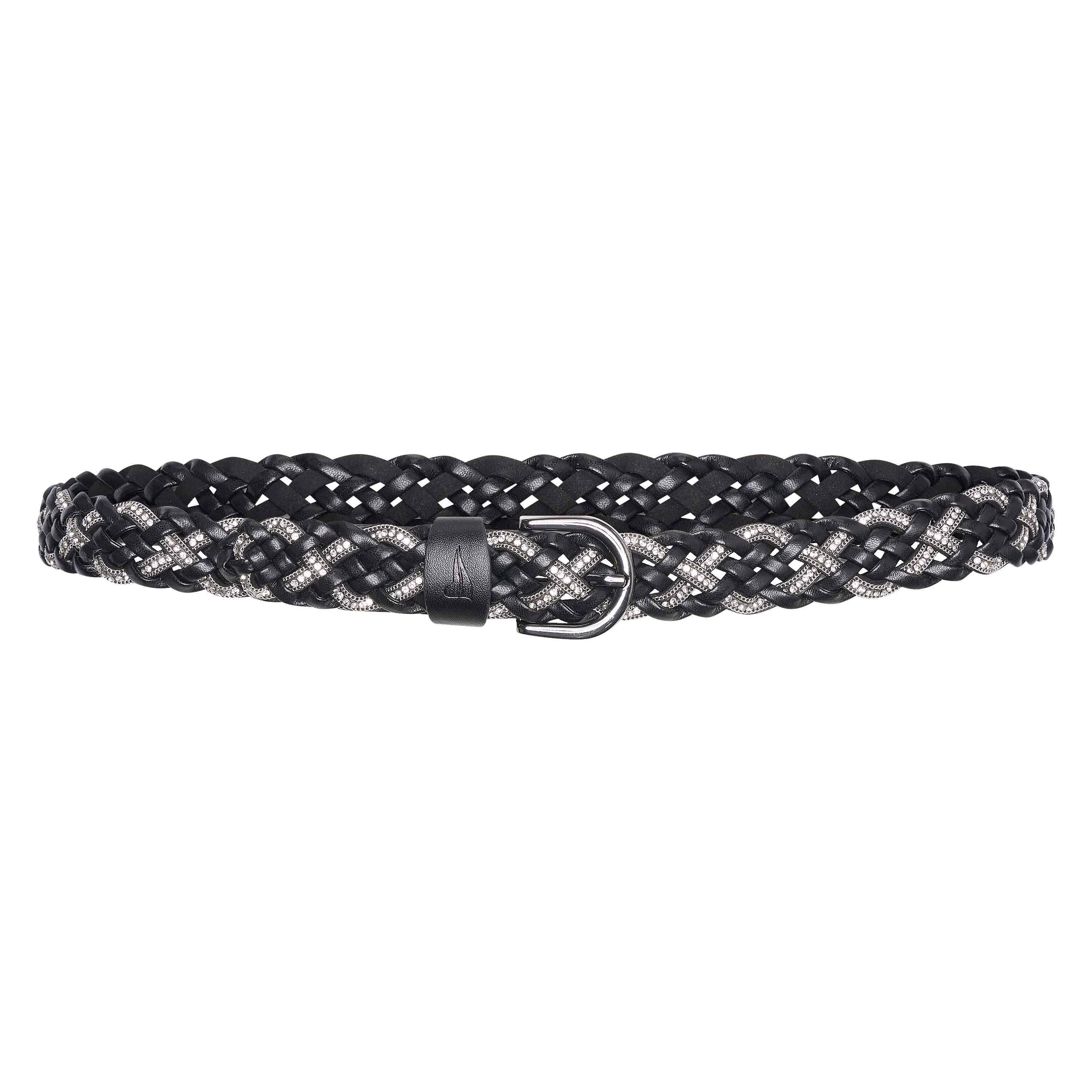 Nahkavyö, kiiltävä ja joustava strassinauha punottu yhteen nahkanauhojen kanssa. Mukava istuvuus, pyöristetty solki.