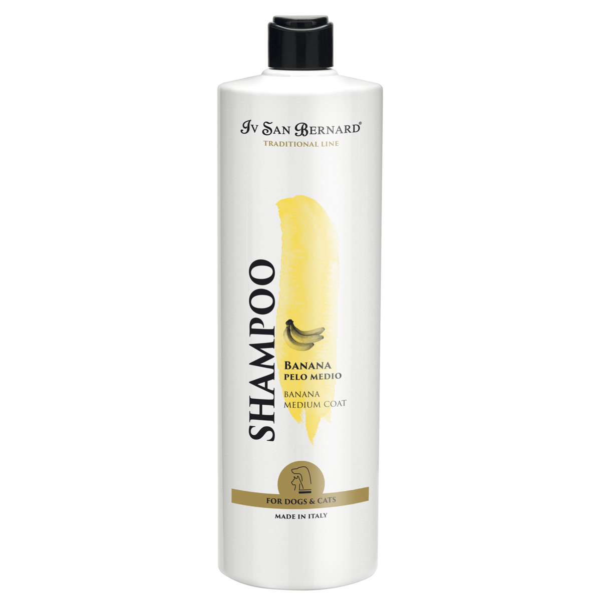 Iv San Bernard Banana Shampoo Banaanin tuoksuinen shampoo keskipitkille turkeille koirille ja kissoille 500ml, 1L, 3L. Sen hellävarainen ja kosteuttava vaikutus antaa turkille kimmoisuutta ja tekee siitä kiiltävän ja kauniin.