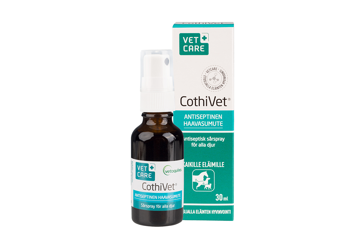 Suihkuta Cothivetia suoraan haavan päälle 3-4 kertaa päivässä kunnes haava on parantunut.