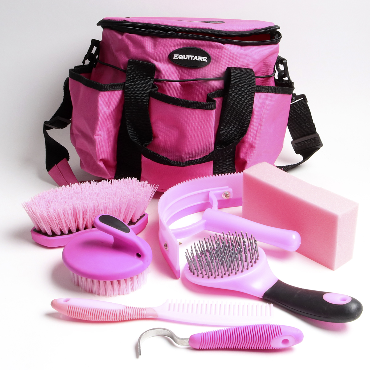 Sisältää mm. kuivain, kaviokoukku, kampa, pesusieni ja erilaisia harjoja.