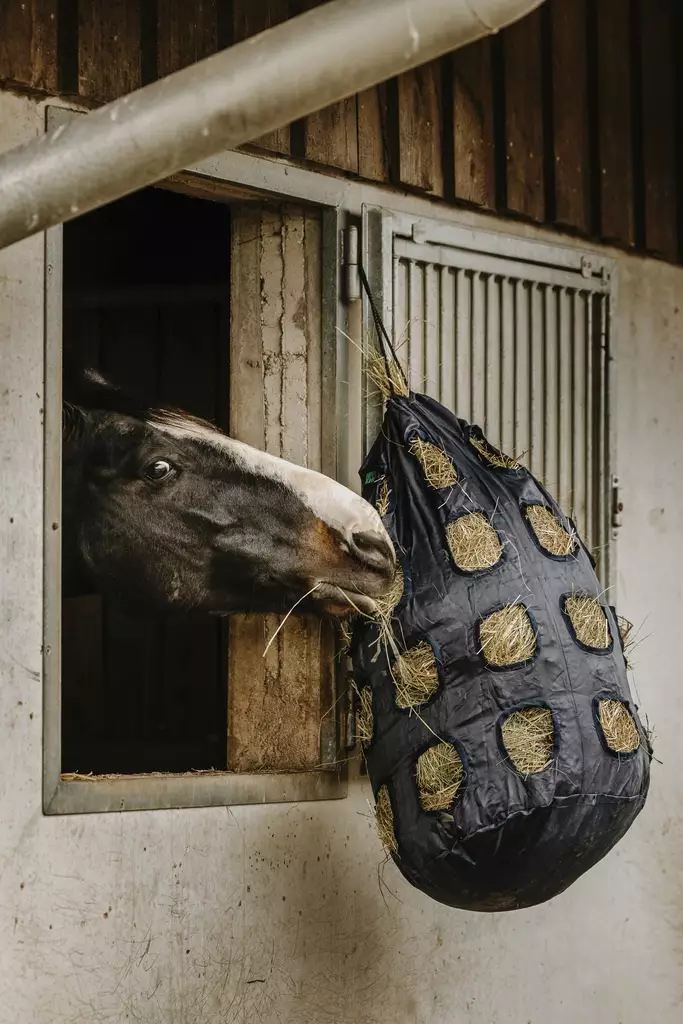 Materiaali 420D polyesterikangas. Varustettu 32 kappaleella 9 cm halkaisijaltaan olevilla aukoilla sekä suljentamekanismilla. Mahdollistaa hevosen helpon pääsyn heinään.