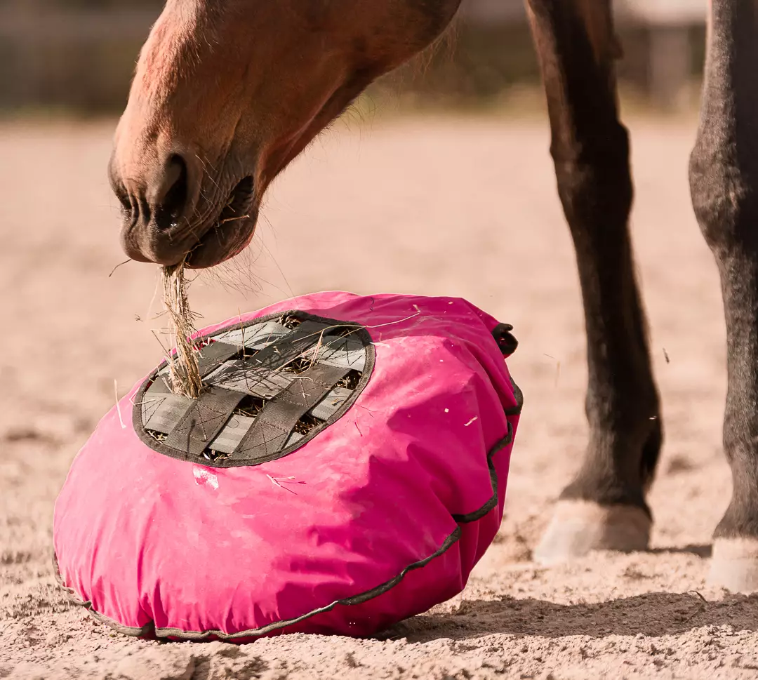 Heinätyyny auttaa lyhentämään ruokintavälejä, hidastaa syömistä ja antaa puuhaa pidemmäksi aikaa. Täytä tyyny heinällä, sulje kolmella suurella napilla ja anna hevoselle puuhailtavaksi. Monesti hevonen valitsee syödä ensin tyynystä ja sitten vasta siirtyy syömään irtoheinää. Fluffy Feeder on helppo huuhtaista käytön jälkeen letkulla puhtaaksi ja tarvittaessa sen voi pestä pesukoneessa 40 asteessa. Kuivuu nopeasti.
