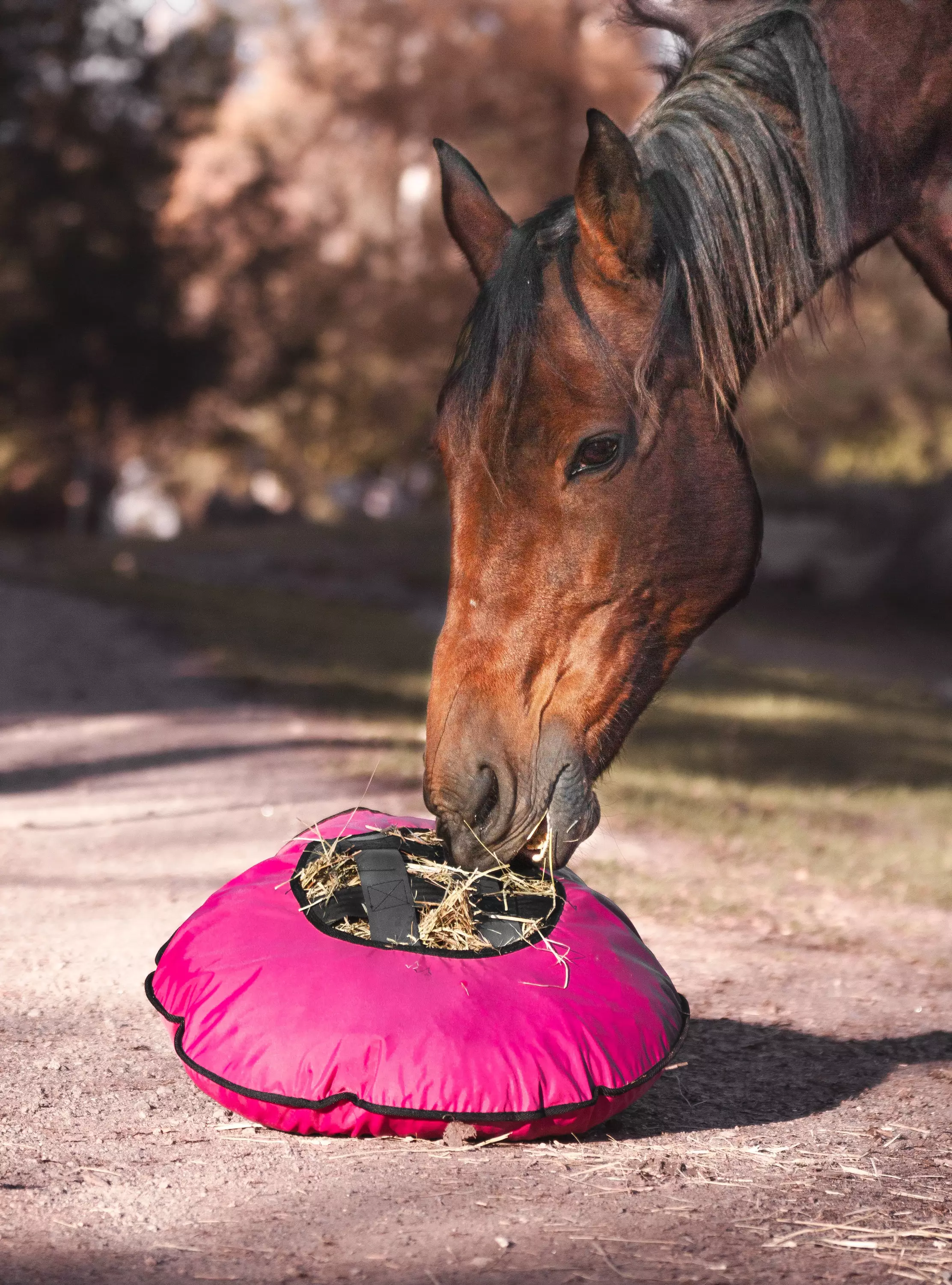 Heinätyyny auttaa lyhentämään ruokintavälejä, hidastaa syömistä ja antaa puuhaa pidemmäksi aikaa. Täytä tyyny heinällä, sulje kolmella suurella napilla ja anna hevoselle puuhailtavaksi. Monesti hevonen valitsee syödä ensin tyynystä ja sitten vasta siirtyy syömään irtoheinää. Fluffy Feeder on helppo huuhtaista käytön jälkeen letkulla ja tarvittaessa sen voi pestä pesukoneessa 40 asteessa. Kuivuu nopeasti.