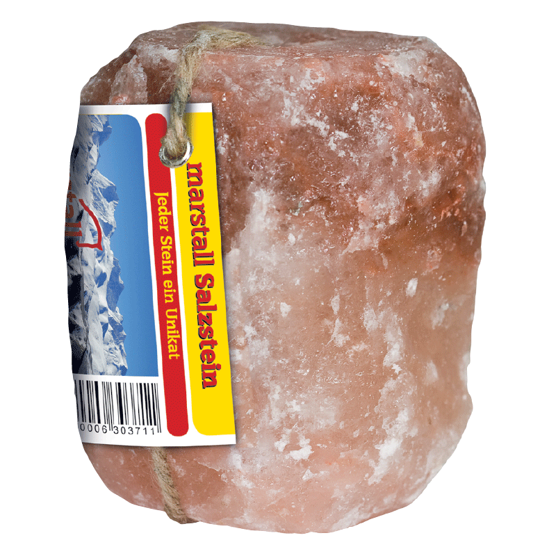 * Jokainen yksittäinen kivi on ainutlaatuinen ja yhtä puhdas ja runsaasti mineraaleja kuin silloin, kun se luotiin. Korkealla NaCl -pitoisuudella > 97,50 % jokaisella Marstall -suolakivellä on Codex Alimentariuksen mukainen ruokasuolan laatu. Se on käytännöllinen kiinnittää poratun reiän ja narun ansiosta.