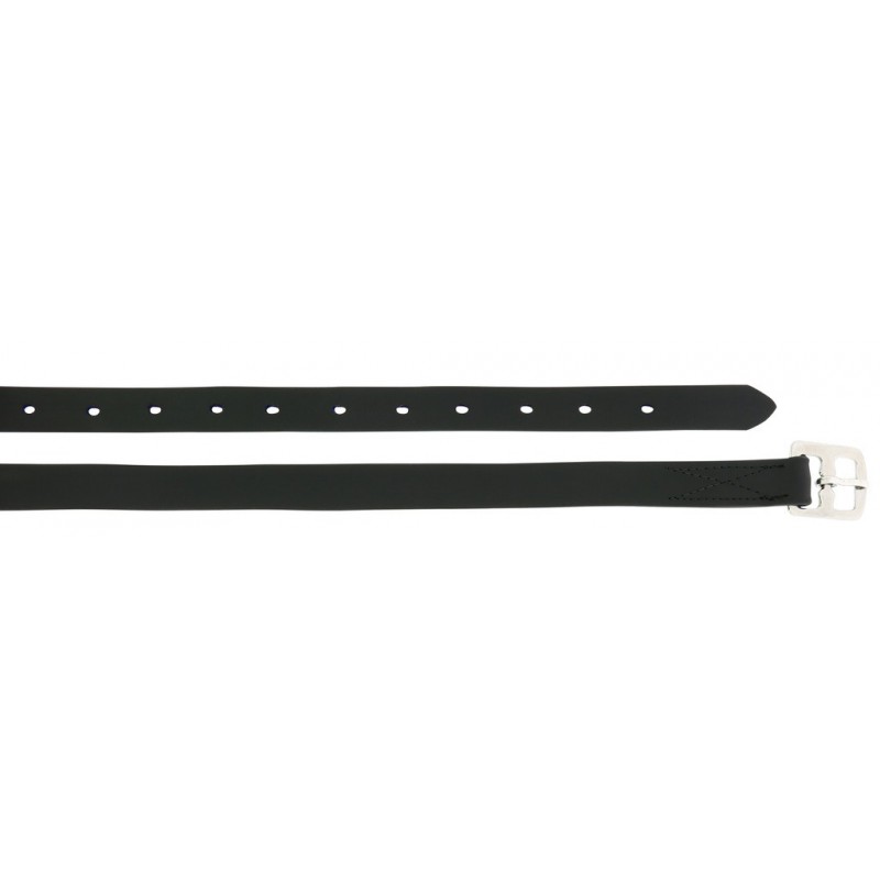 Synteettiset jalustinhihnat. Jalustinhihnan sisällä kulkee sininen nylonvahvike, joka näkyy lähinnä reikien kohdalla. Materiaalina PVC ja ruostumaton teräs.