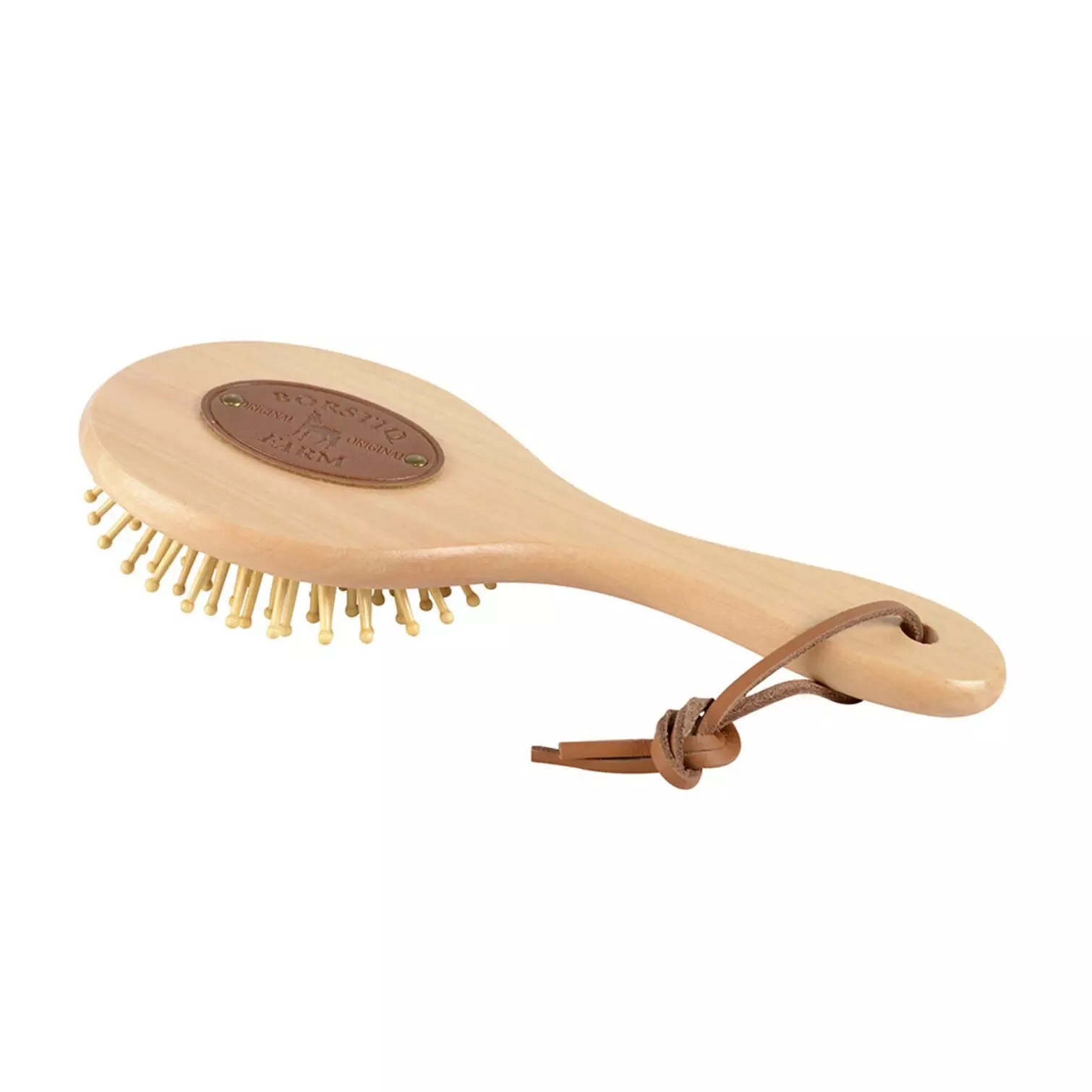 Rund massageborste, som också kan användas både för man och svans. Tillverkad i bokträ och designad med en greppvänlig läderrem.