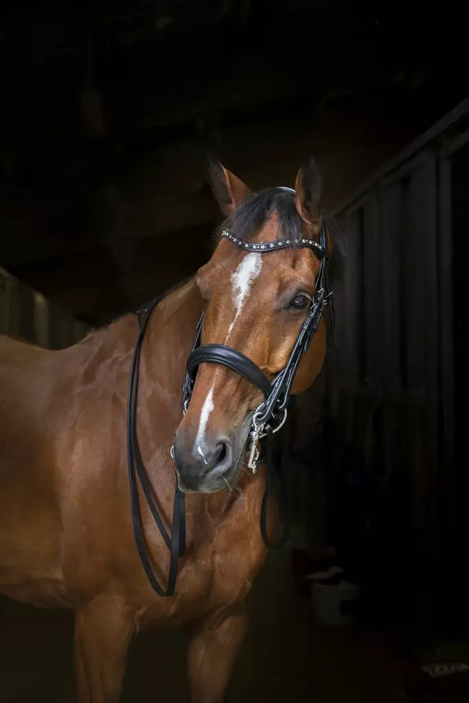 Pehmeällä Clarino-vuorauksella varustetut nahkaiset kankisuitset, joissa on topattu niskahihna ja pullback-turpahihna. Kaarevassa otsapannassa koristekiviä.