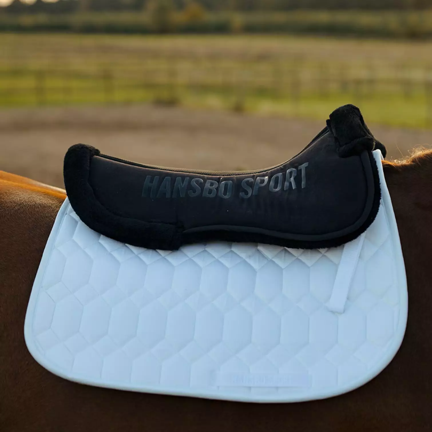 Funktionell och stilfull sadelpad med lyxigt sytetisk päls på undersida och kanter. Hansbo Sport loggo av silicon för extra grip. Stötdämpande och tryckfördelande. Kanal för ryggfrihet.