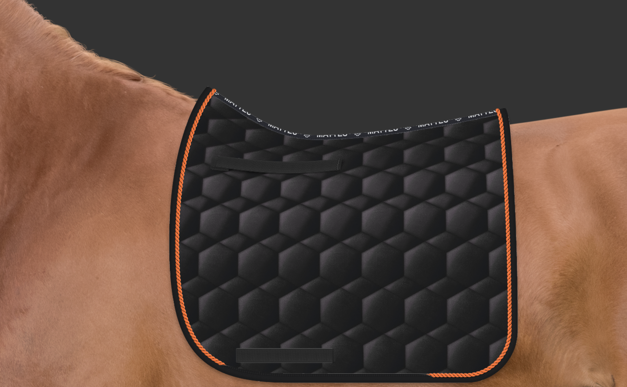 Neliömäinen kouluratsastushuopa ihanan sileää ja kiiltävää, helppohoitoista materiaalia. Mustaa huopaa kiertää oranssi nyöritys.