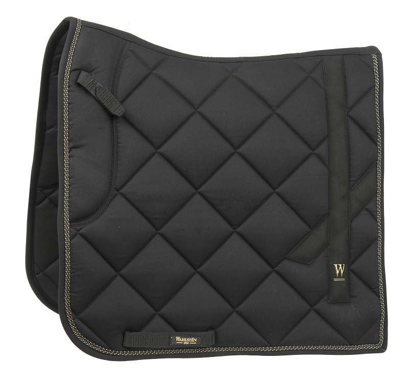 Hyvin muotoiltu koulusatulahuopa. Päällinen puuvillaa ja quick dry -vuori. Avattavat satulavyön lenkit. Kullanväriset tehosteet koristenyörissä ja logossa.