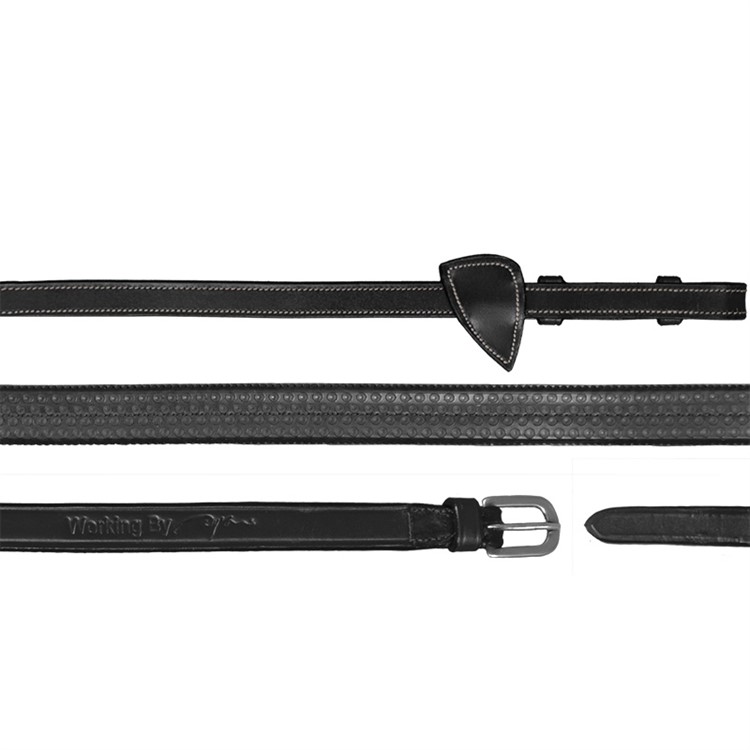 Dyonin Working Collection -sarjan leveämmät kumiohjat puhvelinnahalla ja sisäänpäin käännetyillä, hopeisilla soljilla sekä martingaalistoppareilla.
