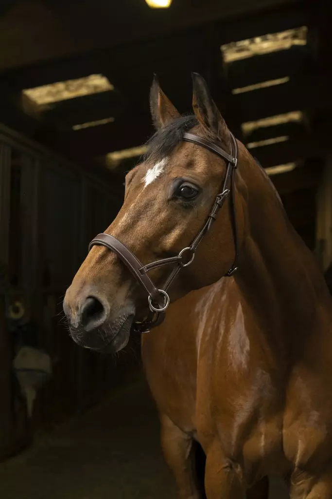 Puhvelinnahkaiset, kuolaimettomat side-pull suitset, ilman ohjia. Turpahihna ja otsapanta vuorattu lehmännahalla. Valkoiset tikkaukset.