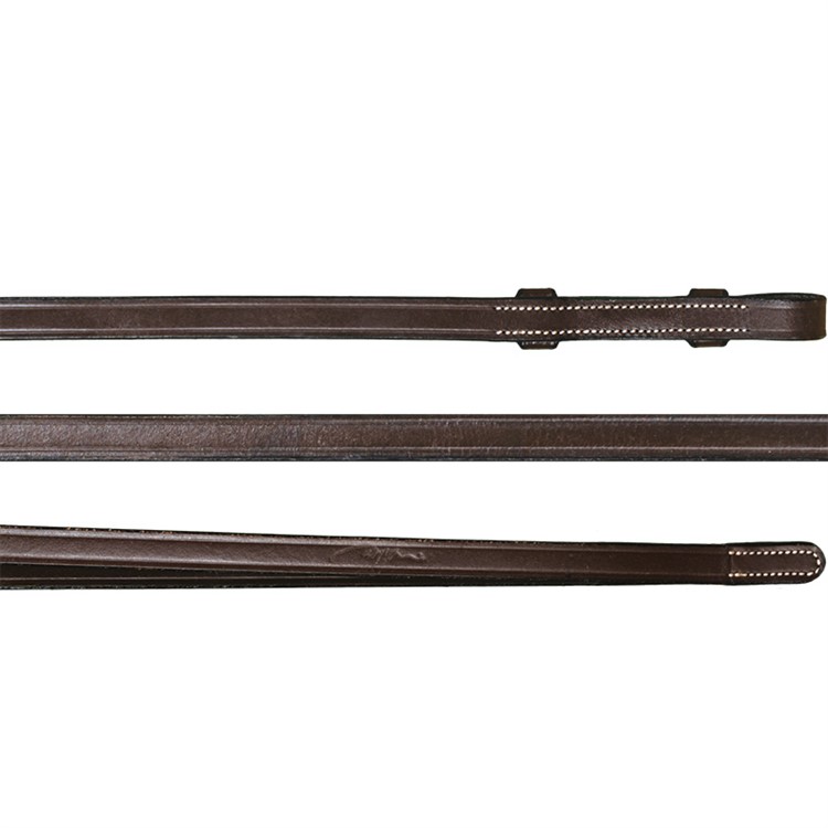 Sileät nahkaiset ohjat puhvelinahkaa sisäänpäin käännetyllä soljella.
