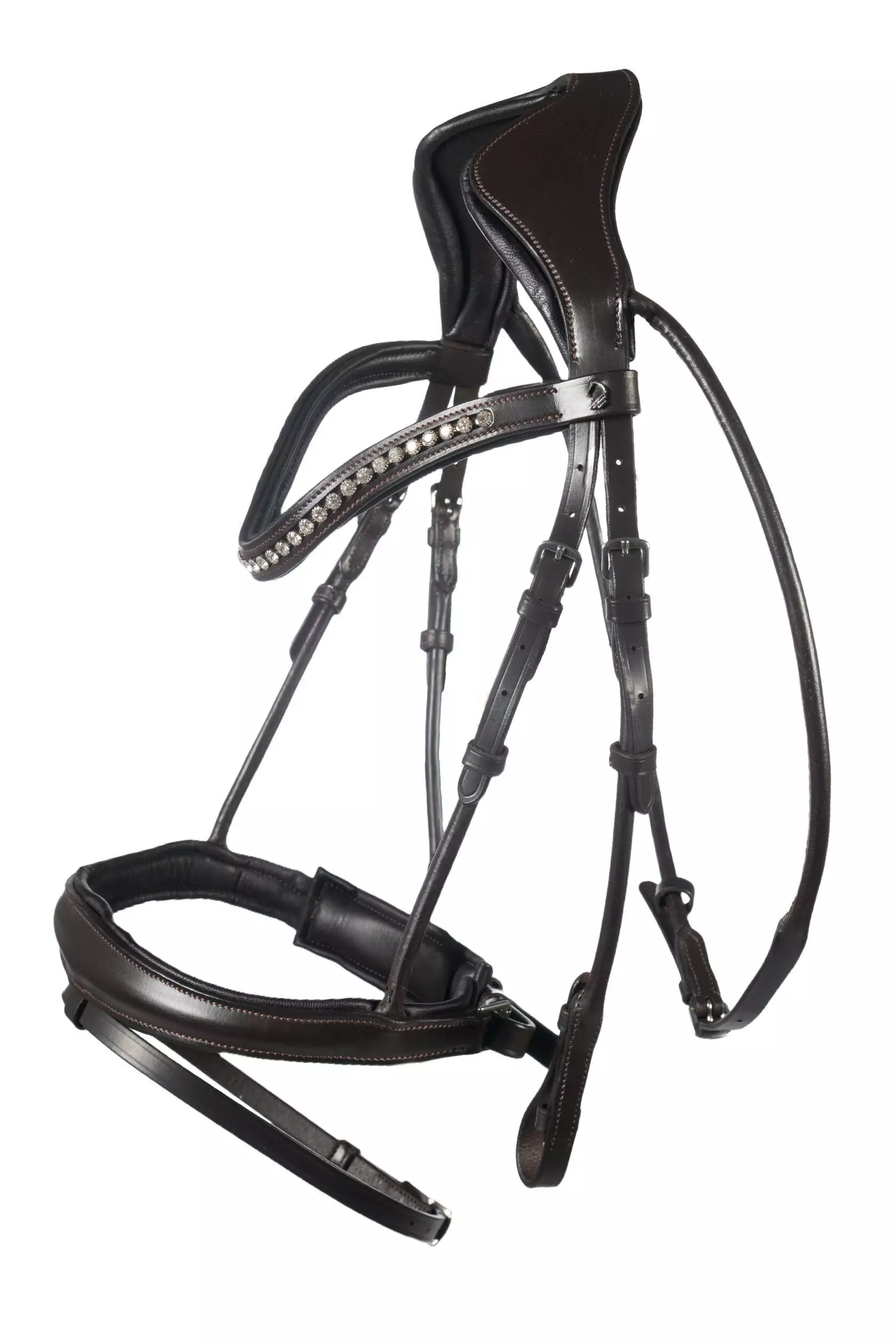 Laadukkaasta nahasta valmistetut anatomiset suitset, otsapannassa koristeellisia kiviä.