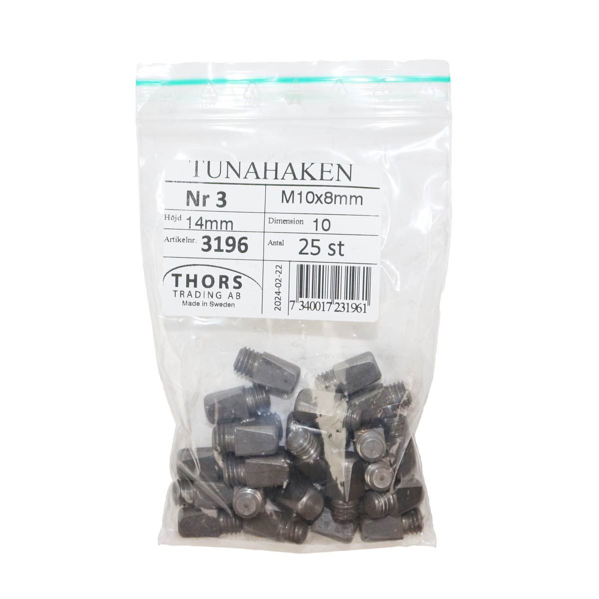 8 mm:n kenkään, kierre M10, pituus 14 mm. Pussissa 25 kpl.