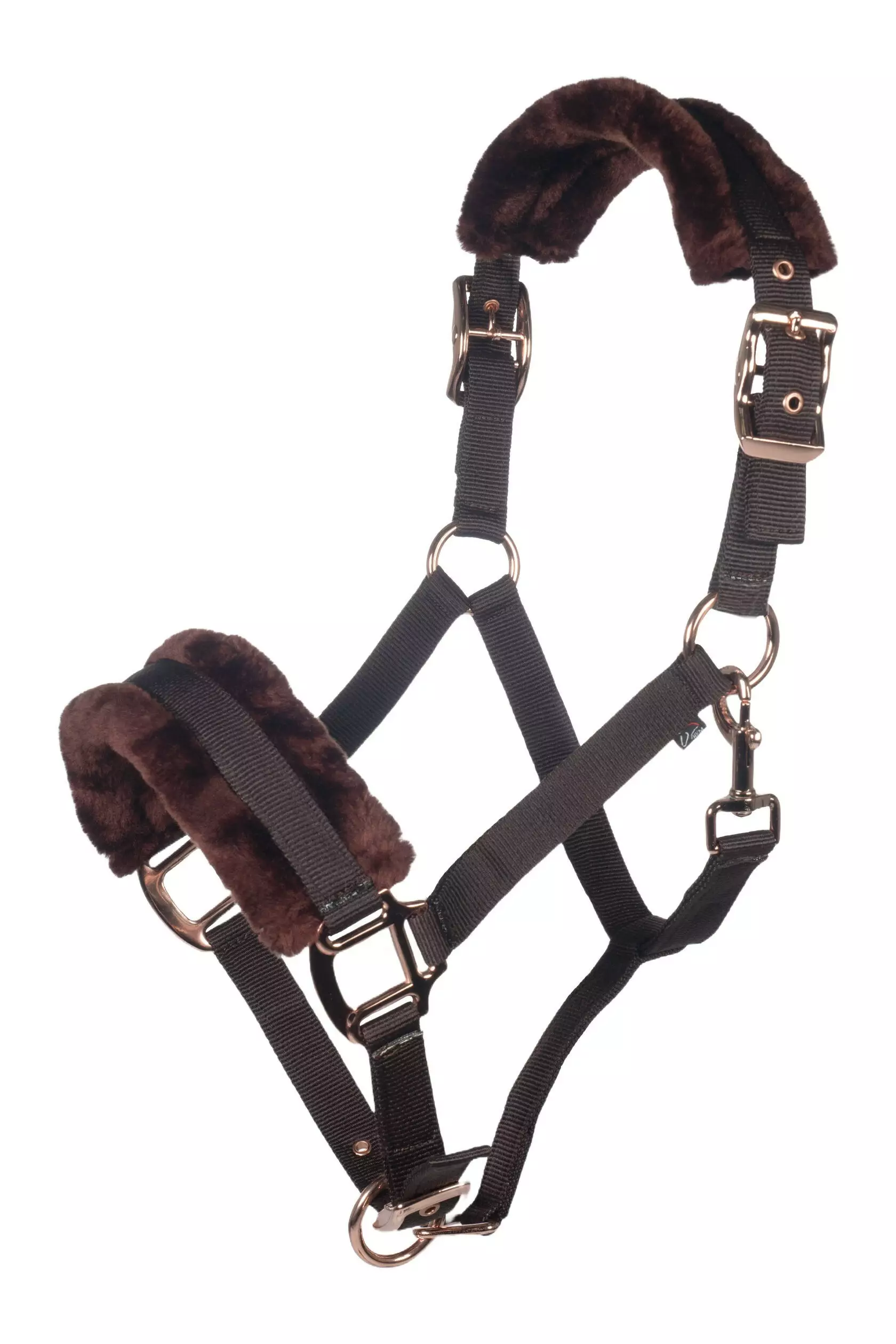 Rosegold Glamour Style -riimu yhdistää erinomaisen mukavuuden ja tyylikkäät yksityiskohdat. Pehmeästi topattu turpahihna ja otsapanta tekevät riimusta miellyttävän käyttää, ja keinotekoinen lampaankarva lisää sekä suojaa että hienostuneen ulkonäön. Kätevän pikalukon ansiosta riimu on helppo avata ja sulkea. Säädettävä niskahihna molemmin puolin sekä säädettävä turpahihna takaavat täydellisen istuvuuden. Kokonaisuuden viimeistelevät kestävät, ruusukullanväriset metalliosat, jotka antavat riimulle erityisen tyylikkään ilmeen.