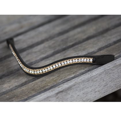 Laadukas otsapanta, jossa on kaareva muoto ja kolme riviä kullan ja hopean värisiä timanttikoristeita.