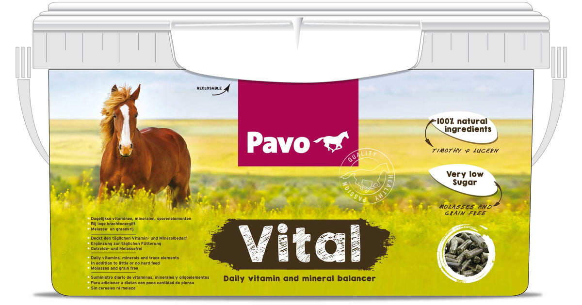 Hevosen päivittäisen ruokinnan tasapainottajana. Pelletti sisältää kaikki hevosesi tarvitsemat vitamiinit ja kivennäisaineet. Pavo Vital on valmistettu 100% luonnollisista raaka-aineista eikä se sisällä mitään ylimääräisiä lisäaineita.