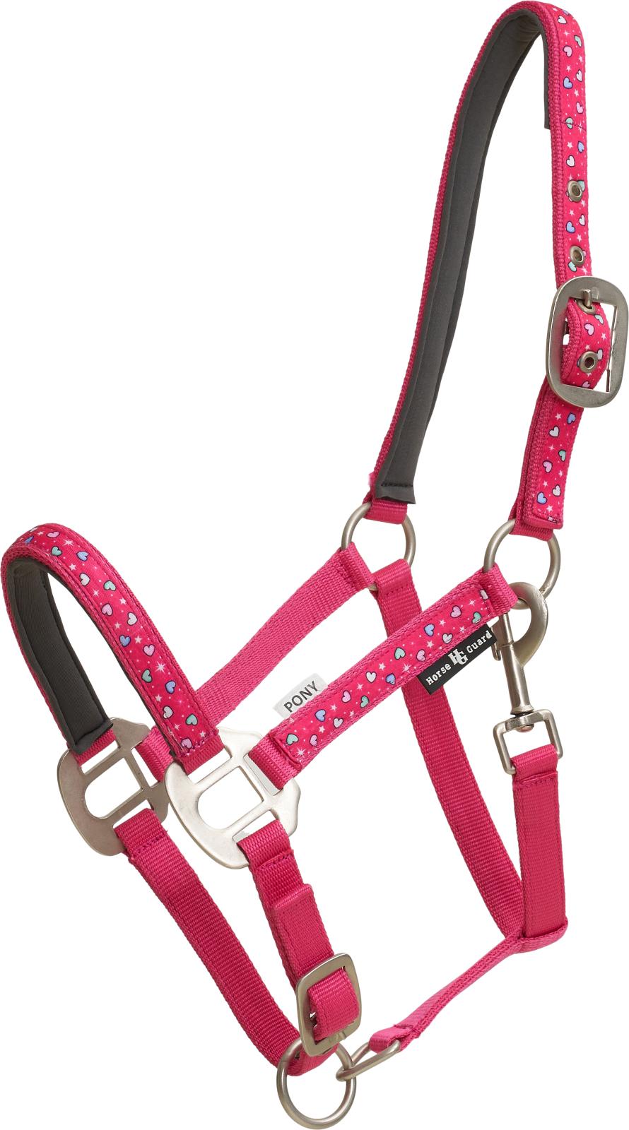 Vaaleanpunainen riimu, jossa on suloisen värikäs sydänkuvio. Säädettävän turparemmin ja niskakappaleen neopreenipehmusteet tarjoavat mukavuutta ja suojaa.