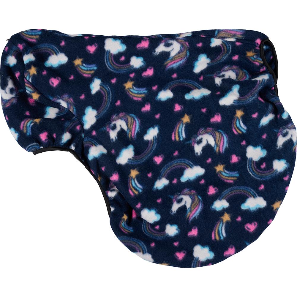 Supersöpö satulapeite, kokonaan kuvioitua fleecea. Kuosissa on yksisarvisia, sateenkaaria, sydämiä ja lenteleviä tähtiä iloisessa värisinfoniassa.