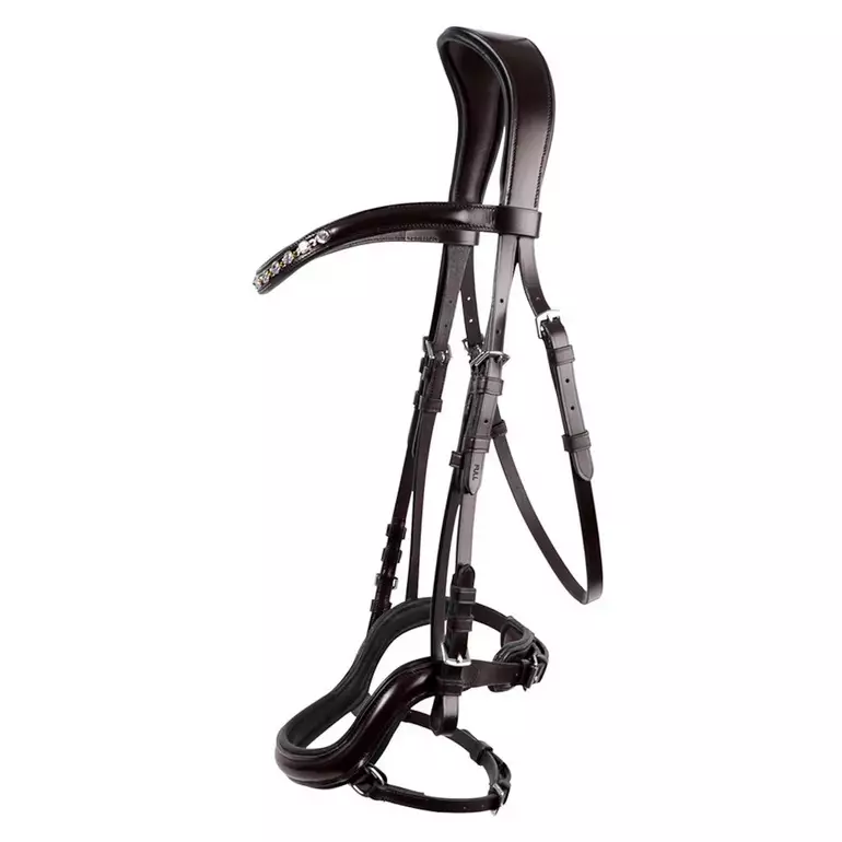 Huolellisesti valmistetut ja elegantit suitset, joissa on ergonomisesti muotoiltu niskakappale ja kaareva turpahihna. Valmistettu korkealaatuisesta kasviparkitusta nahasta, joka takaa kestävyyden ja miellyttävän käyttökokemuksen. Pehmeä toppaus turpahihnassa, otsapannassa ja niskakappaleessa lisää mukavuutta hevoselle. Tyylikäs strassikoristeltu otsapanta, jossa on eri metallisävyjä, sekä hopeanväriset soljet viimeistelevät kokonaisuuden näyttävästi. Myydään ilman ohjia.