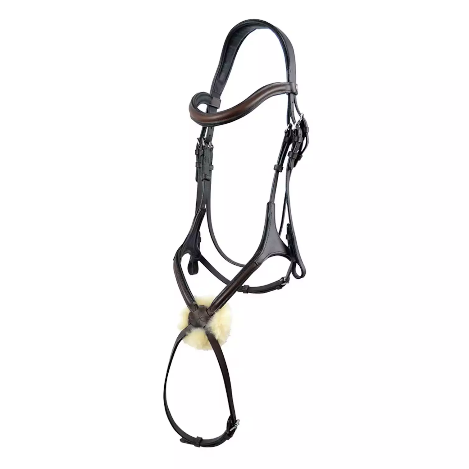Välarbetat elegant träns med ergonomiskt utformat nackstycke och mexikanskt nosgrimma (Grackle), kallas också pullarnosgrimma utan ringar. Tillverkat av högkvalitativt mjukt läder, med mjuk vaddering vid nosgrimma, pannband och nackstycke samt högkvalitativ fuskpäls vid nosryggen. Silverfärgade spännen.