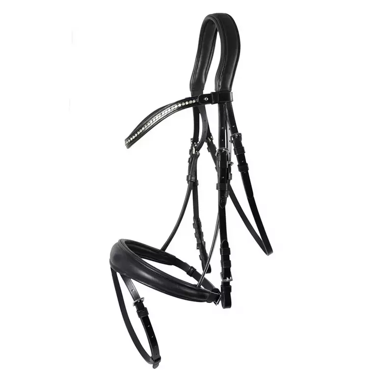 Huolellisesti valmistetut ja elegantit suitset, joissa on ergonomisesti muotoiltu niskakappale sekä Aachenturpahihna piilotetulla kiinnityksellä turpahihnan alahihnalle. Valmistettu korkealaatuisesta kasviparkitusta nahasta, joka takaa kestävyyden ja käyttömukavuuden. Pehmeä toppaus turpahihnassa, otsapannassa ja niskakappaleessa lisää hevosen mukavuutta. Tyylikäs avattava strassikoristeltu otsapanta sekä hopeanväriset soljet viimeistelevät kokonaisuuden näyttävästi. Myydään ilman ohjia.