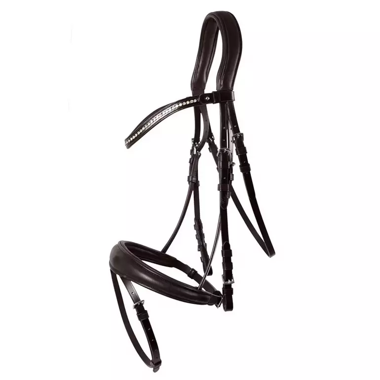 Pehmeä toppaus turpahihnassa, otsapannassa ja niskakappaleessa lisää hevosen mukavuutta. Tyylikäs avattava strassikoristeltu otsapanta sekä hopeanväriset soljet viimeistelevät kokonaisuuden näyttävästi.