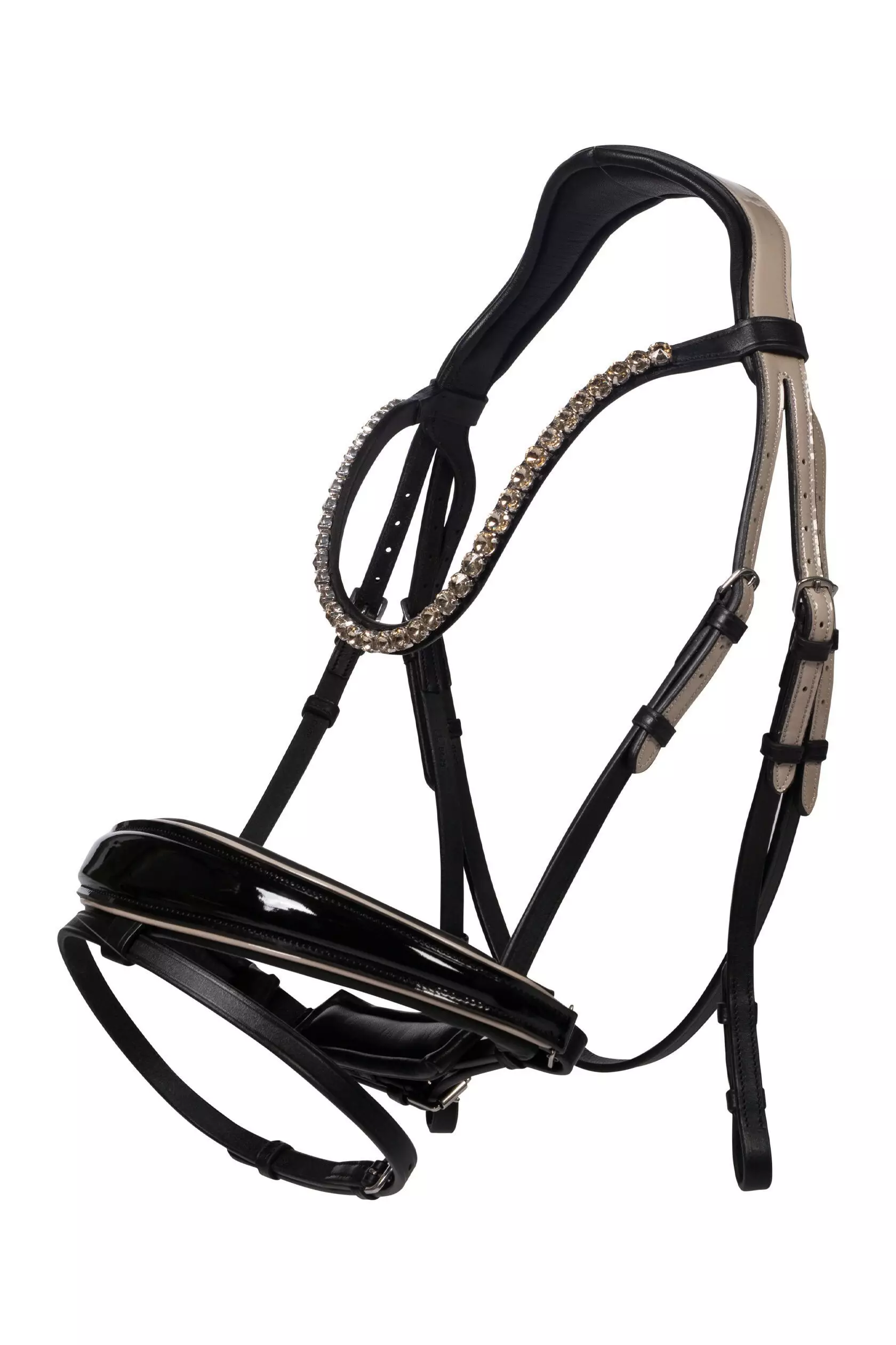 Tyylikkäät Limone Elegant -suitset yhdistävät näyttävän ulkonäön ja mukavuuden. Suitset on valmistettu laadukkaasta nahasta, ja niiden pehmustettu niskahihna sekä erittäin pehmeä viimeistely takaavat miellyttävän istuvuuden hevoselle. Suitset on varustettu ruotsalaisella turpahihnalla, jossa on switching-kiinnitys, sekä näyttävällä otsapannalla suurilla kristalleilla. Erikoiset lakkapintaiset yksityiskohdat tuovat suitsiin elegantin ja viimeistellyn ilmeen. Mukana tulevat punotut ohjat nahkaisilla stopparilla, jotka tarjoavat hyvän pidon ratsastuksen aikana. Laadukkaat metalliosat viimeistelevät kokonaisuuden.