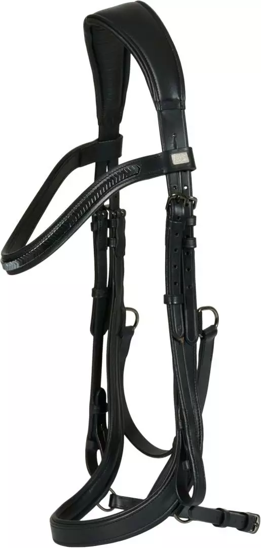 Hevosen nahksuitset anatomisesti muotoillulla turparemmillä sekä niskahihnalla. Mukana 16mm grippiohjat.