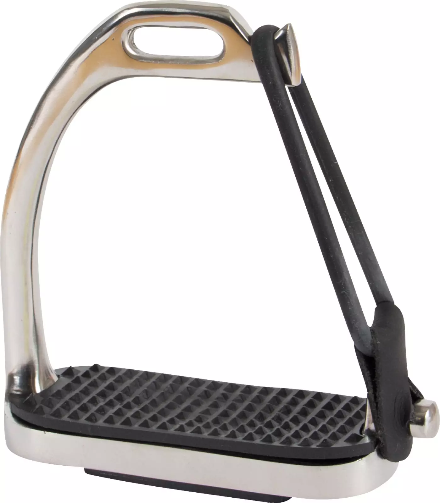 Ruostumattomasta teräksestä valmistettu turvajalustin, jossa on sivulla jousto-osa ja kumipohjallinen.