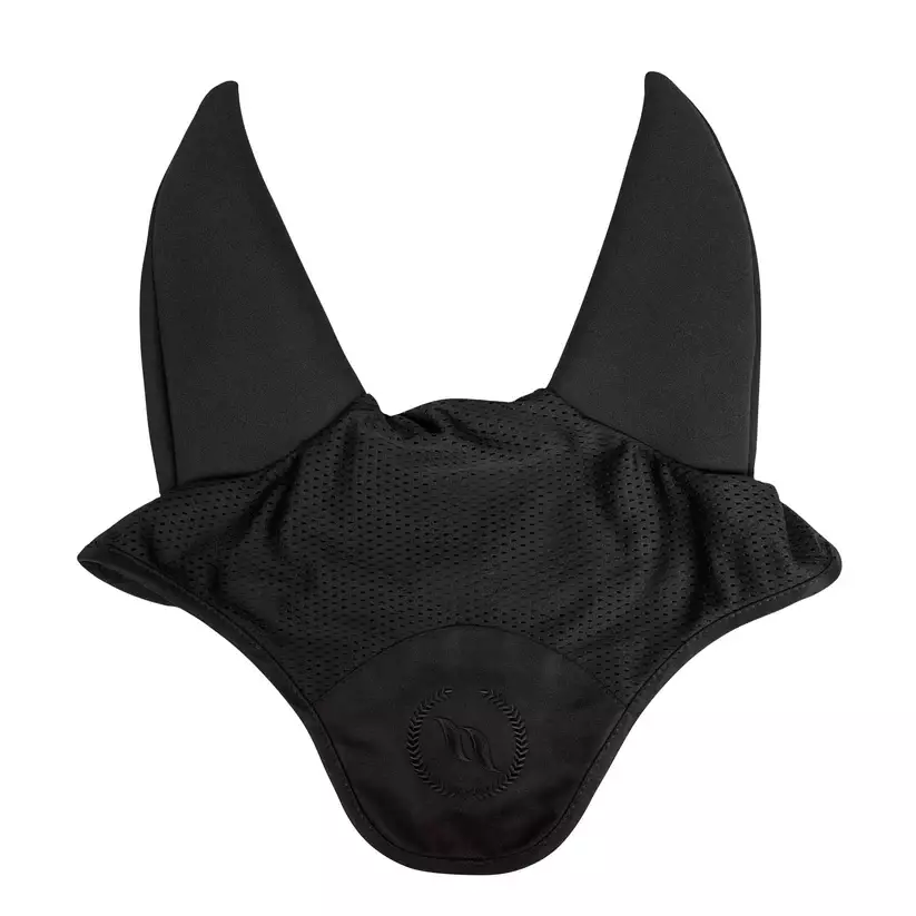Ääntä vaimentava ja erittäin tyylikäs musta korvahuppu suojaa hevosta ärsykkeiltä ja häiriötekijöiltä.