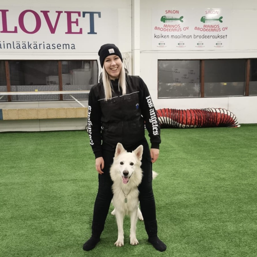 Olen Nea ja kuvassa kanssani on valkoinenpaimenkoira Jeri. Olen ollut koiraihminen pienestä pitäen ja perheeseeni kuuluu myös seniori-ikäinen perhoskoira. Jerin kanssa olemme harrastaneet rally-tokoa ja koiratanssia, mutta olemme kokeilleet myös muunmuassa hoopersia ja uusimpana canicrossia.