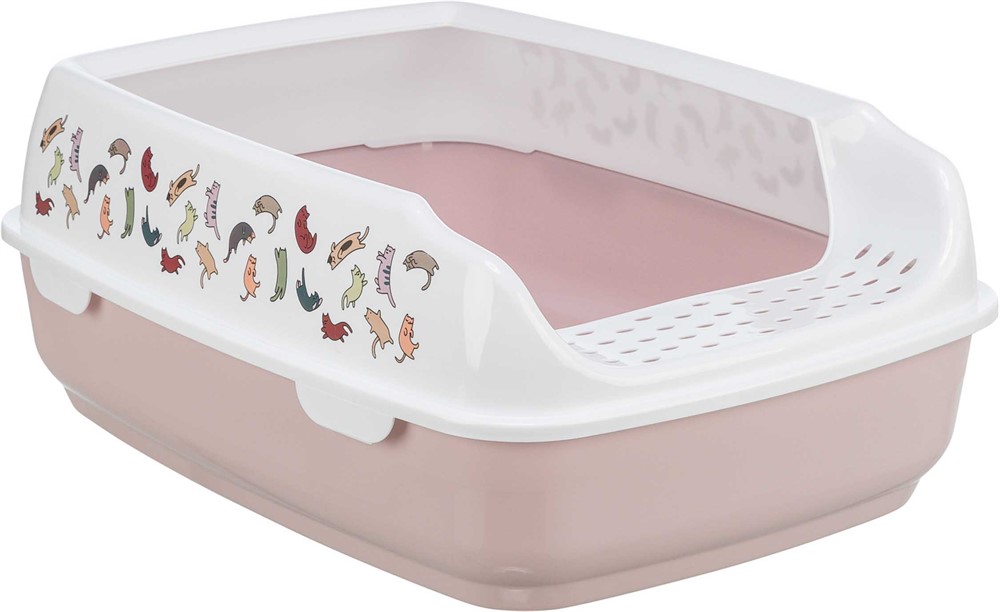 Tyylikäs, muovinen avovessa reunaa kiertävällä kissakuviolla. Irrotettava, korotettu reunus ehkäisee hiekan kulkeutumista.