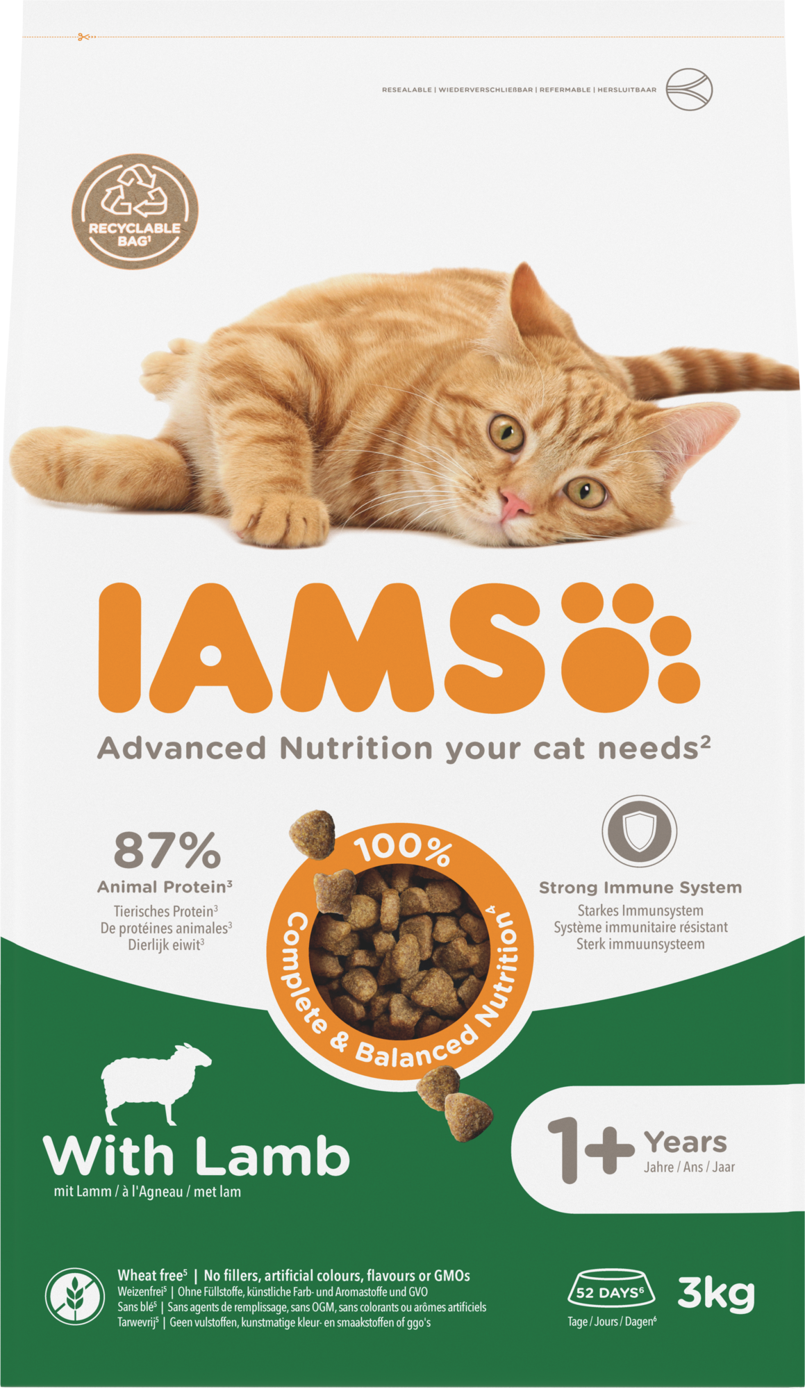 Lammasta sisältävä täysikasvuisten kissojen IAMS Vitality on 100-prosenttisen täydellinen ja tasapainoinen ravinto, joka tukee kissasi elinvoimaisuuden seitsemää tekjää. Näin voit ihailla kissasi kiiltävää turkkia ja tervettä ihoa. Saat kaiken tämän maistuvasta ravinnosta, joka sisältää 87 % eläinperäistä proteiinia (kokonaisproteiinimäärästä), jotta lemmikkisi voi nauttia jokaisesta päivästään.