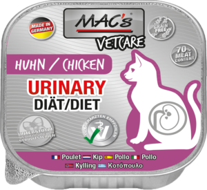 Pakkaus uudistuu! MAC’s Vetcare Chicken virtsakivi/dieetti 100g täysravinto aikuisille kissoille, tukee struviittikivien liukenemista.