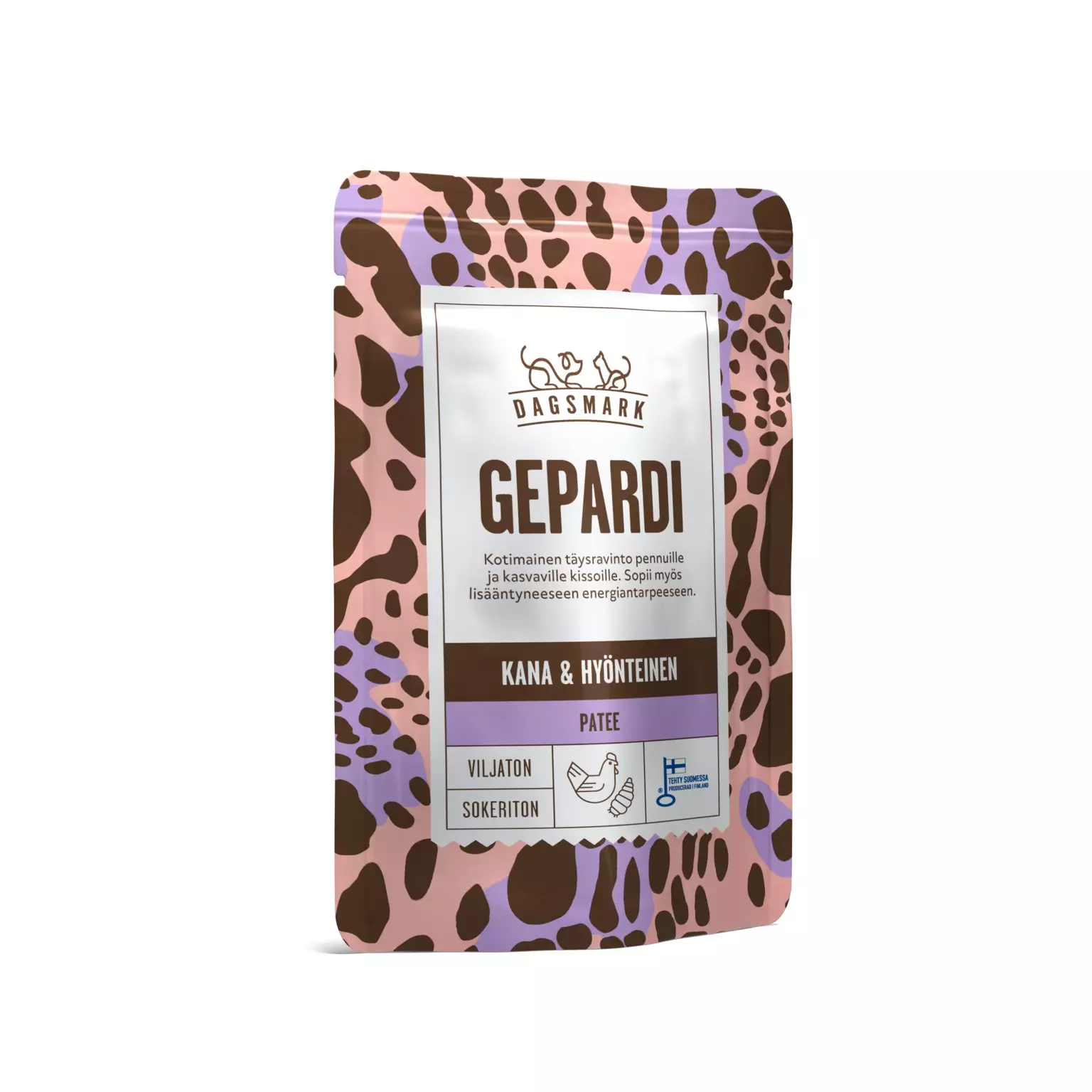 Dagsmark GEPARDI -pateessa on pehmeä, pennuille sopiva koostumus. Sisältää suomalaista tuoretta kanaa sekä ekologista mustasotilaskärpäsen toukkaa.